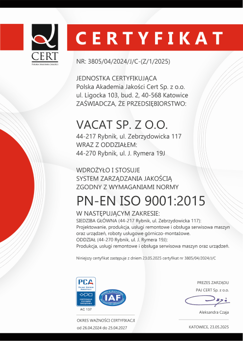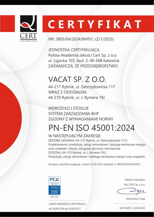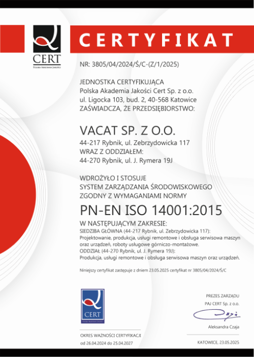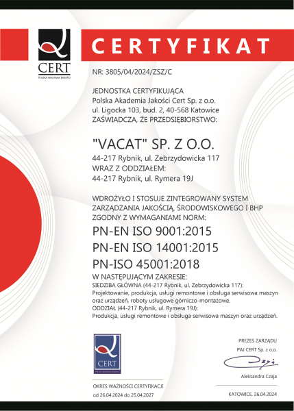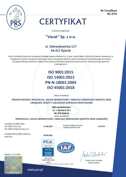 Firma posiada wdrożony System Zarządzania zgodny z normami ISO 9001, ISO 14001 oraz ISO 45001